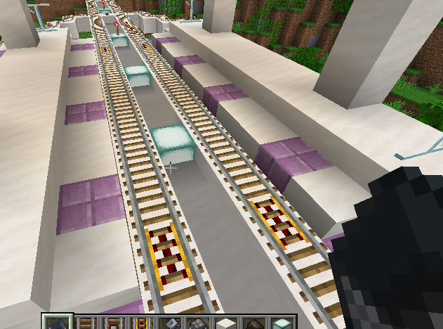↑ A part of my railway. In 24w33a minecarts can travel upwards on the left route at a low speed.
