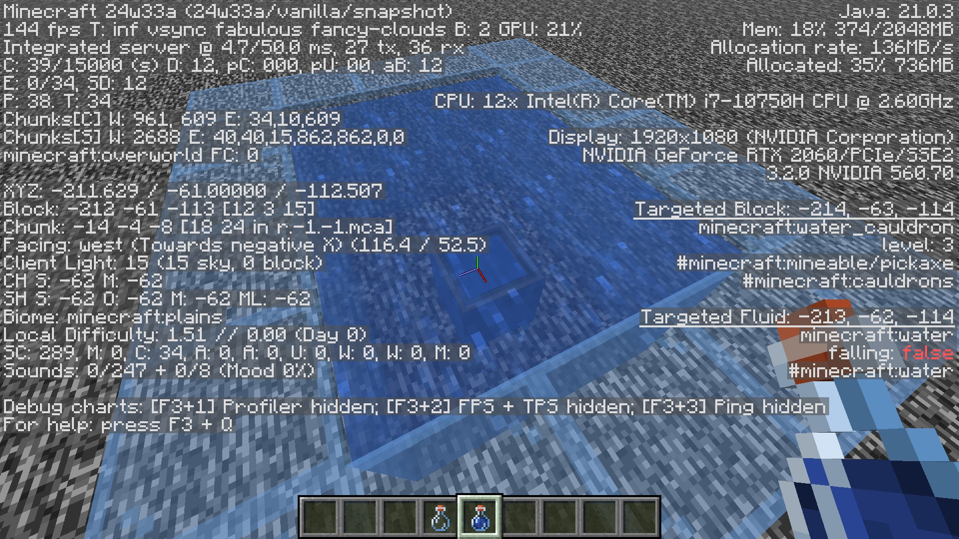 After the changes in 24w33a, if there is a liquid with the tag #water above the cauldron, players cannot interact with it using lava buckets, powder snow bucket, or water buckets.But, you can still interact with the cauldron using water bottle.