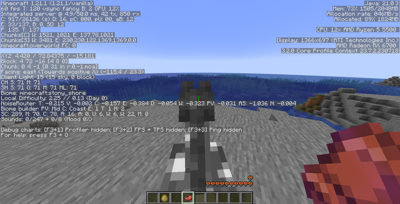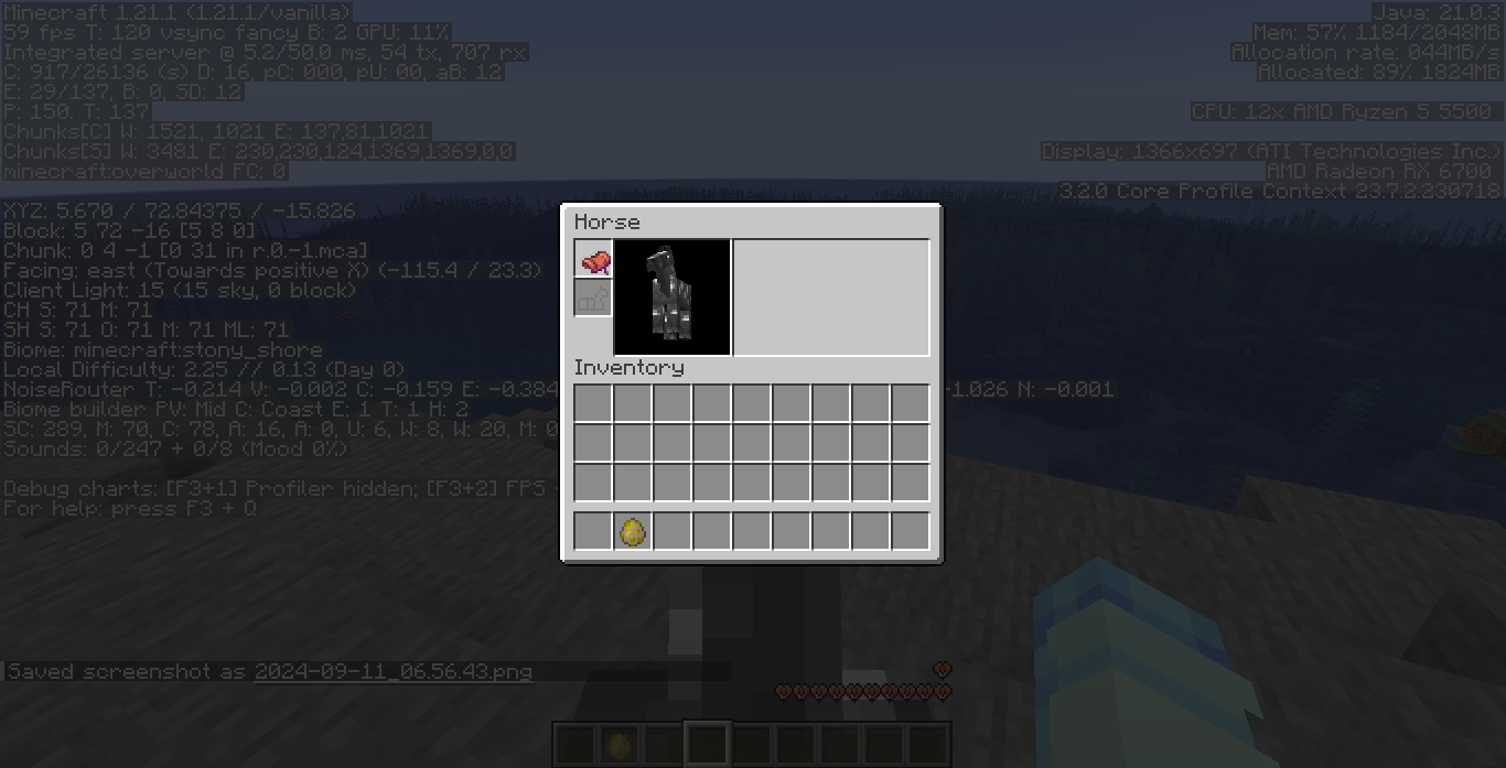 4. Enchant the saddle with "test saddle". Notice how the movement effect gets applied when the player is holding the item, signified by the FOV change.