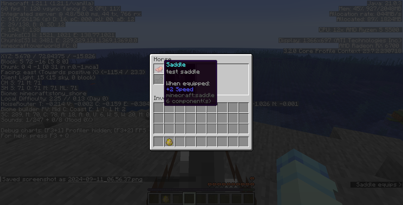 1. Load into a world with the saddle testing datapack attached. It adds saddles to the enchantable/equippable tag, and adds a new enchantment called "test saddle", which adds +2 to the user's movement but also has the prevent_armor_change effect component.