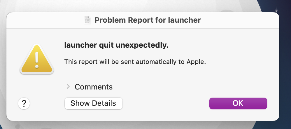 When opening the launcher, it never opens and instead gives me a problem report for the launcher with termination reason: Namespace CODESIGNING, Code 2 Invalid Page .