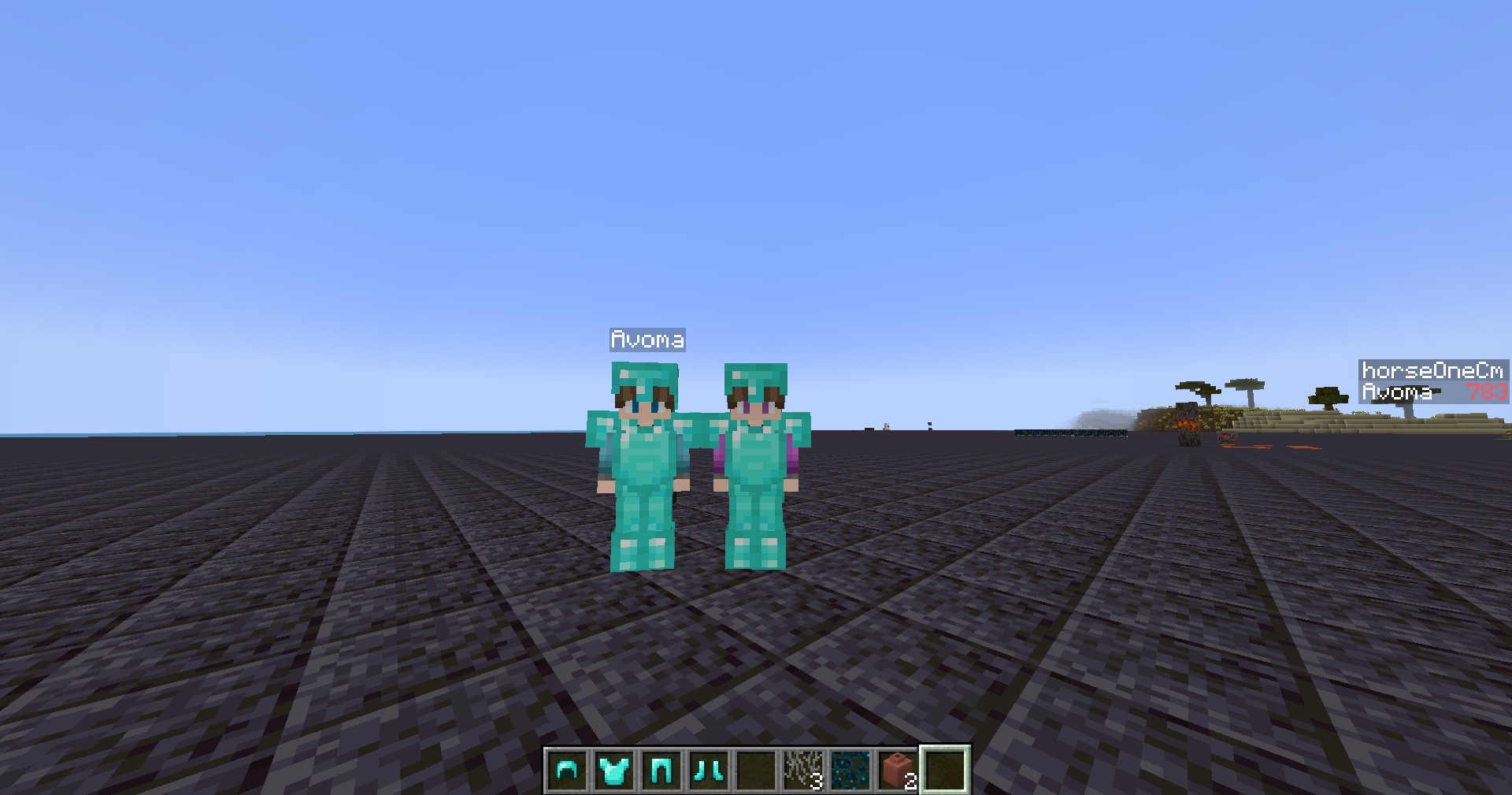 Which player do you think is wearing enchanted diamond armor; the left or right? The player wearing the enchanted armor is on the left, and this is difficult to see due to the enchantment glint being very subtle even when the "Glint Speed" and "Glint Strength" accessibility options are set to "100%".
