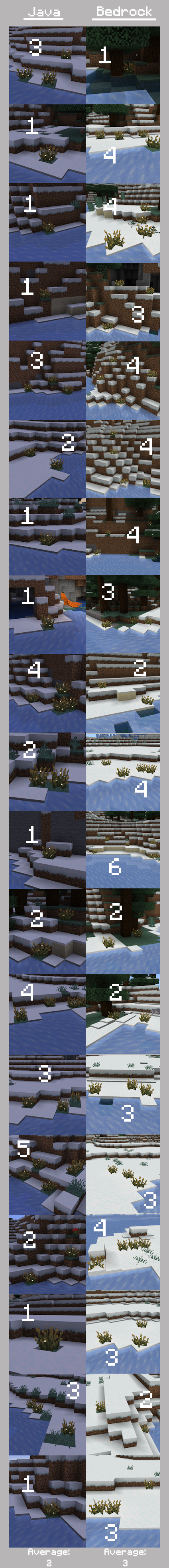 The most common amount of bushes in Java was 1, and the most common amount of bushes in Bedrock was a noticeable 4.