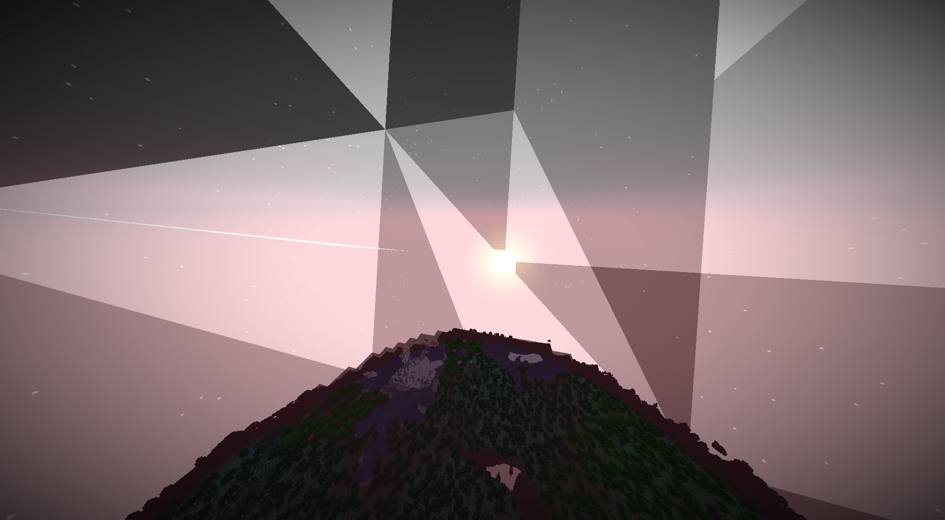 During sunrise, abnormal geometric patterns appear in the sky, with broken shadows and incorrectly rendered light rays. This issue occurs in snapshot 25w09a and can be seen clearly in the attached image.
