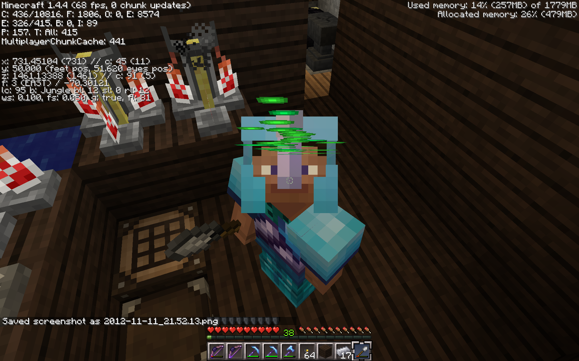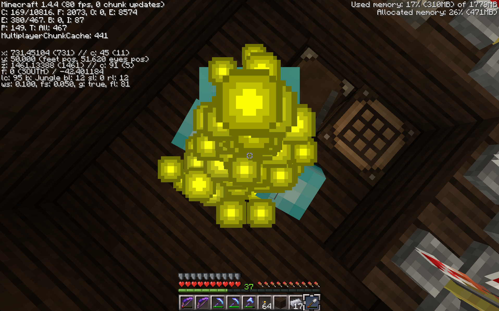 When a lot of XP orbs are orbiting around my avatar, their are displayed differently in the two third-person views. In the "rear" view, the orb always looks round, regardless of the view angle. The the "front" view however, the orbs look like as if they were displayed on a vertical plane and they will disappear if the avatar is looked from top or bottom (the attached picture show them from 45 deg).