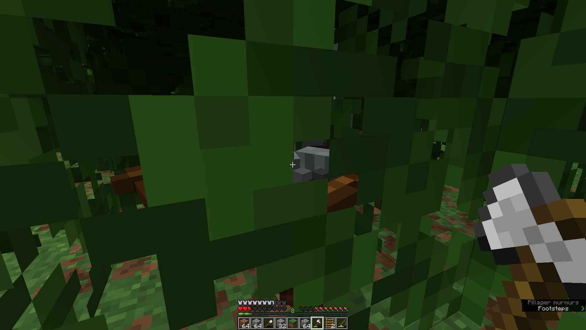 Visiting Pillagers can spawn their top half into leaf blocks; that or their spawning teammates push them into such a position when spawned togther.