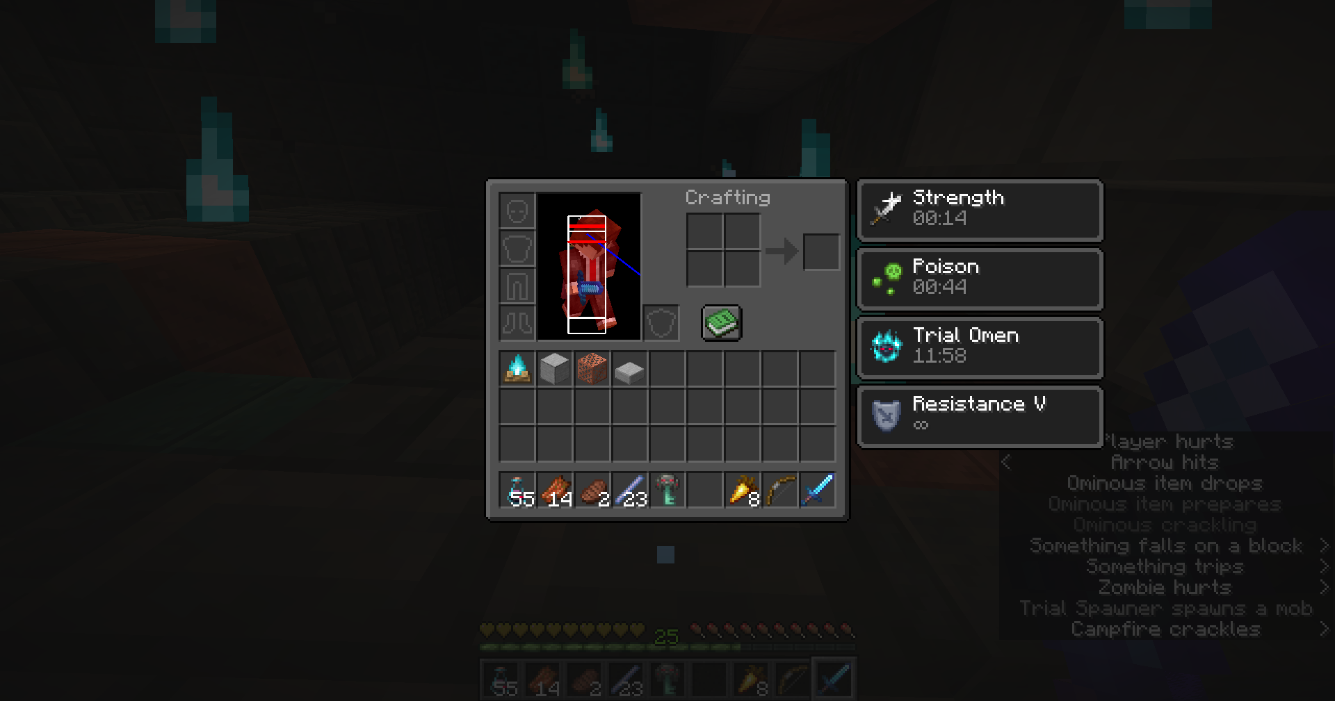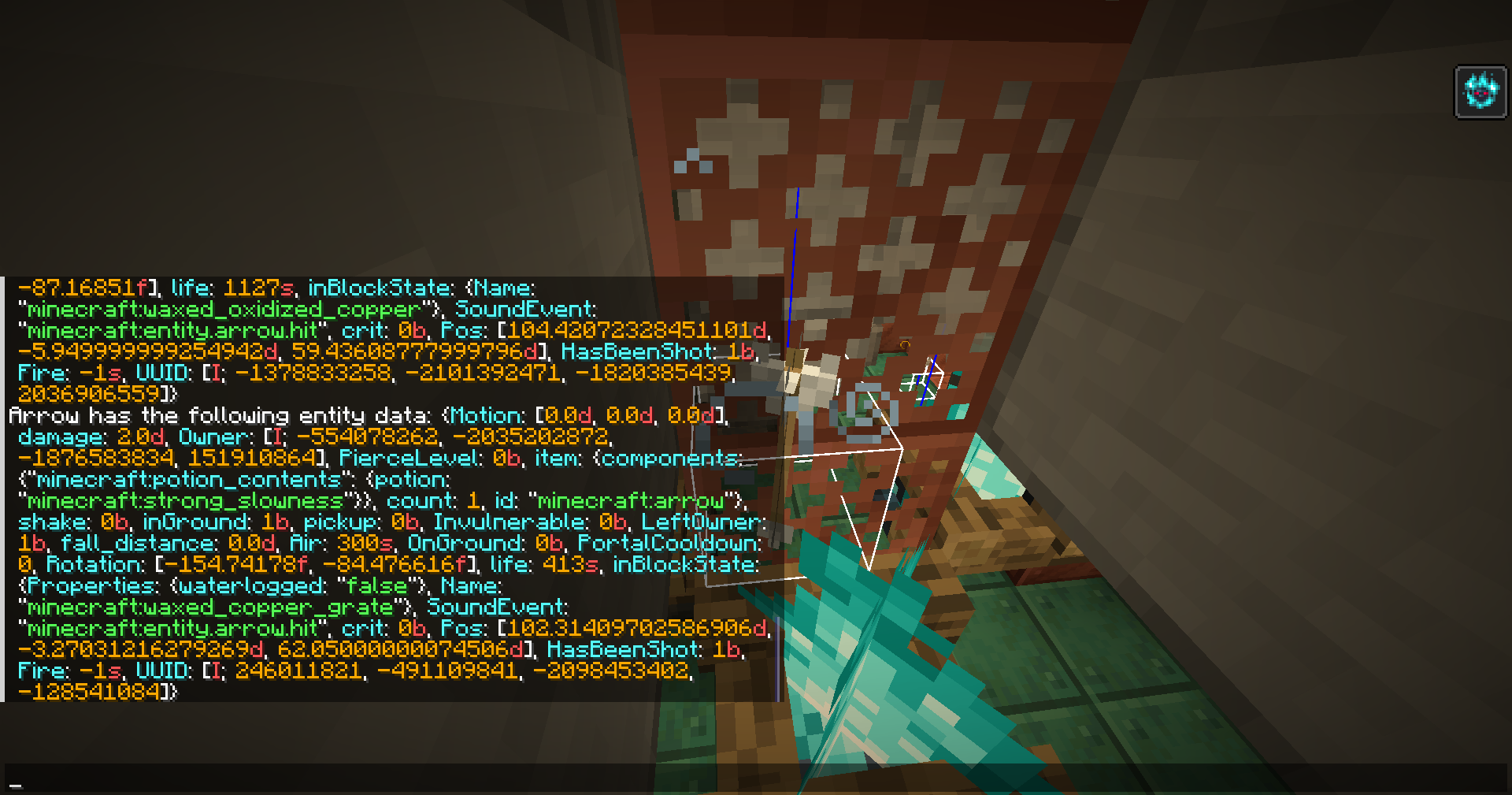 ominous_item_spawnerspawns above your head. If it is a tipped arrow, let the arrow hit you.Observe that the effect duration is the same as the original potions, instead of that of tipped arrows.