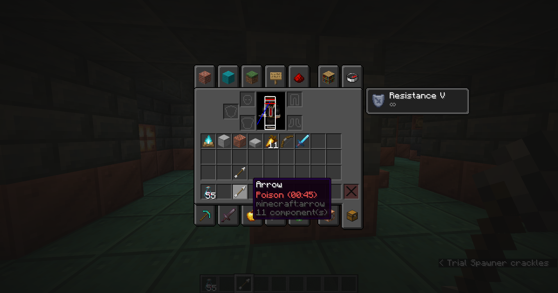 Locate an ominous trial spawner that dispenses arrows of Poison, or arrows of Slowness IV.
