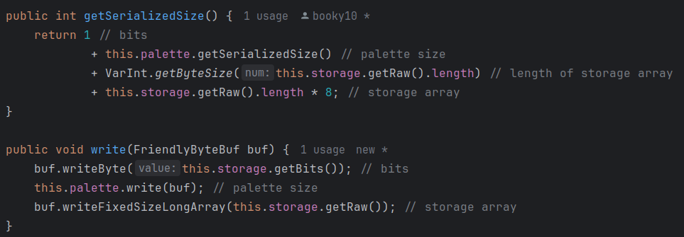 In 25w07a (1.21.5 snapshot), the length prefix for the storage network serialization of PalettedContainer has been removed. Despite this, the method to pre-calculate the serialized size of a PalettedContainer (getSerializedSize) hasn’t been updated. I’ve attached a screenshot of the relevant Mojang-mapped decompiled code snippet in PalettedContainer.