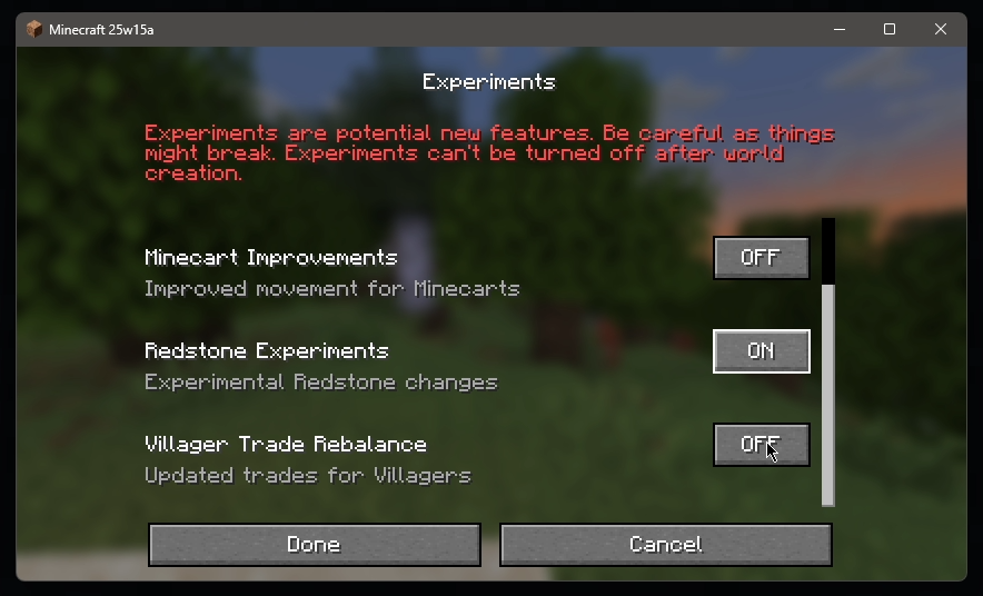 Begin creating a new world and click on the “Experiments” button.