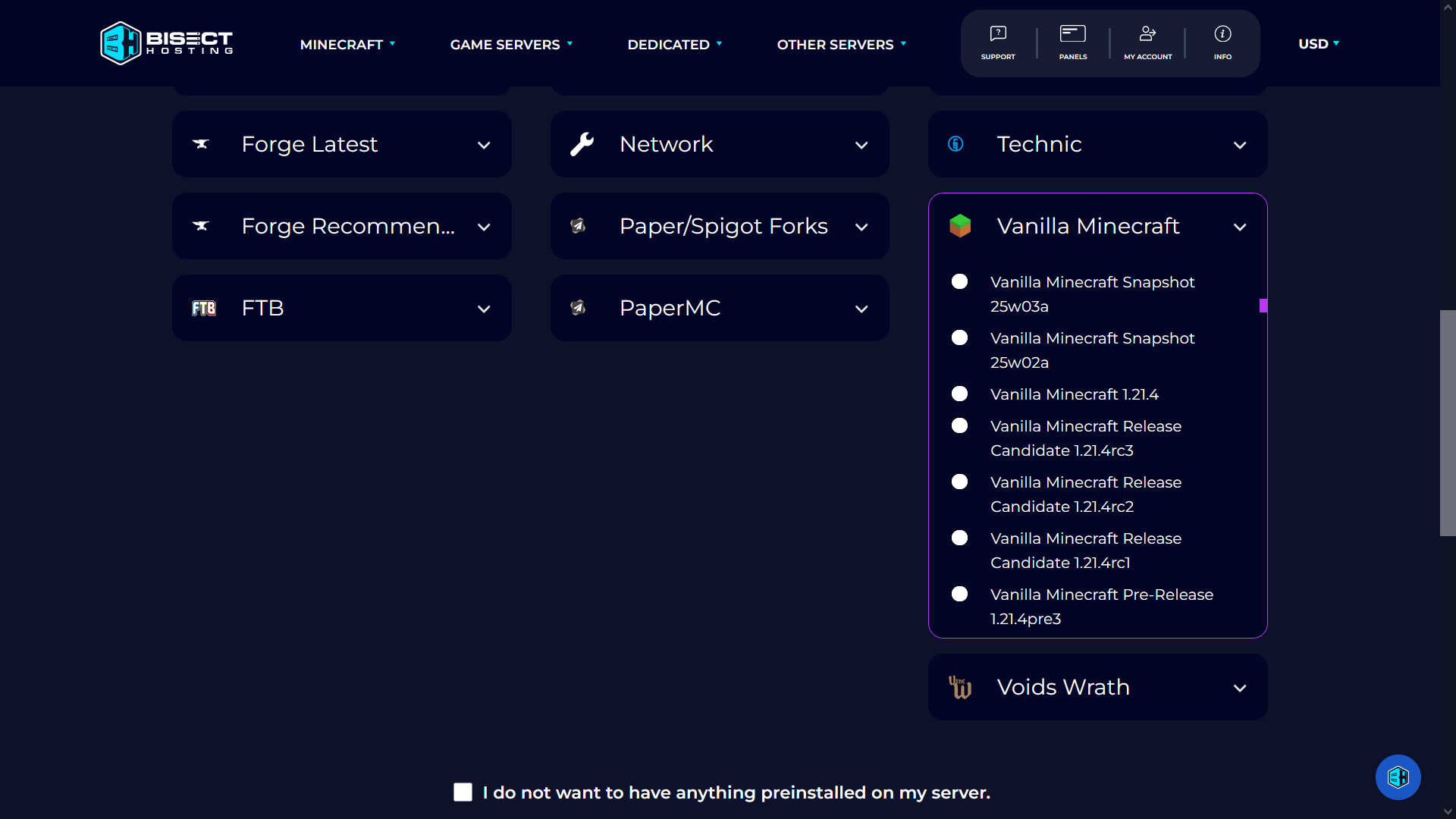 The Server itself is paid hosting by a friend via a company named bisect, specifically selected Vanilla Minecraft 1.21.4 as shown in the screenshots below.