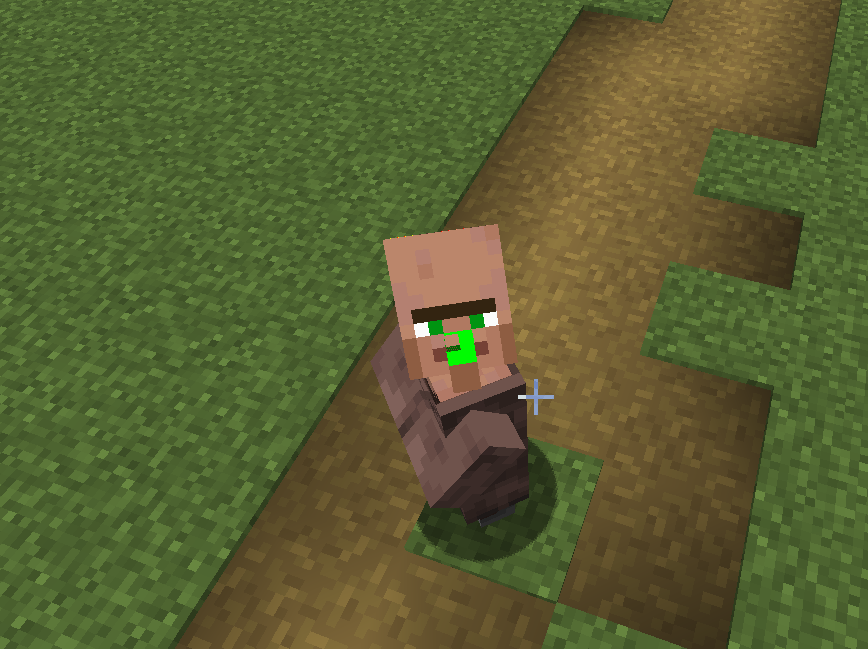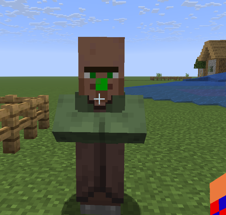 During the gameplay, a defect was discovered in the texture design of the character model "Villager". Pixels in the form of a green square were found on the character's face in the area of the nose, and pixel elements of red and yellow colors are visible on the surface of the head. In addition, there are two small transparent holes on the surface of the model.