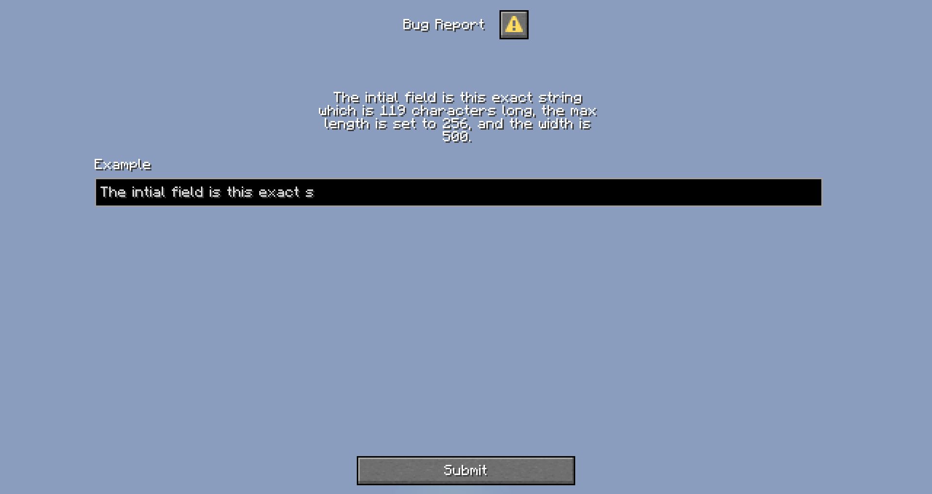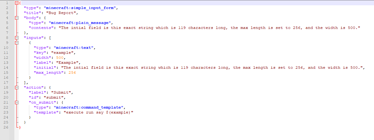 dialog show @p {"type": "minecraft:simple_input_form","title": "Bug Report","body": {"type": "minecraft:plain_message","contents": "The intial field is this exact string which is 119 characters long, the max length is set to 256, and the width is 500."},"inputs": [{"type": "minecraft:text","key": "example","width": 500,"label": "Example","initial": "The intial field is this exact string which is 119 characters long, the max length is set to 256, and the width is 500.","max_length": 256}],"action": {"label": "Submit","id": "submit","on_submit": {"type": "minecraft:command_template","template": "execute run say $(example)"}}}dialog show @p {"type": "minecraft:simple_input_form","title": "Bug Report","body": {"type": "minecraft:plain_message","contents": "The intial field is this exact string which is 119 characters long, the max length is set to 256, and the width is 500."},"inputs": [{"type": "minecraft:text","key": "example","width": 500,"label": "Example","initial": "The intial field is this exact string which is 119 characters long, the max length is set to 256, and the width is 500.","max_length": 256}],"action": {"label": "Submit","id": "submit","on_submit": {"type": "minecraft:command_template","template": "execute run say $(example)"}}}1.21.6 Pre-Release 1: