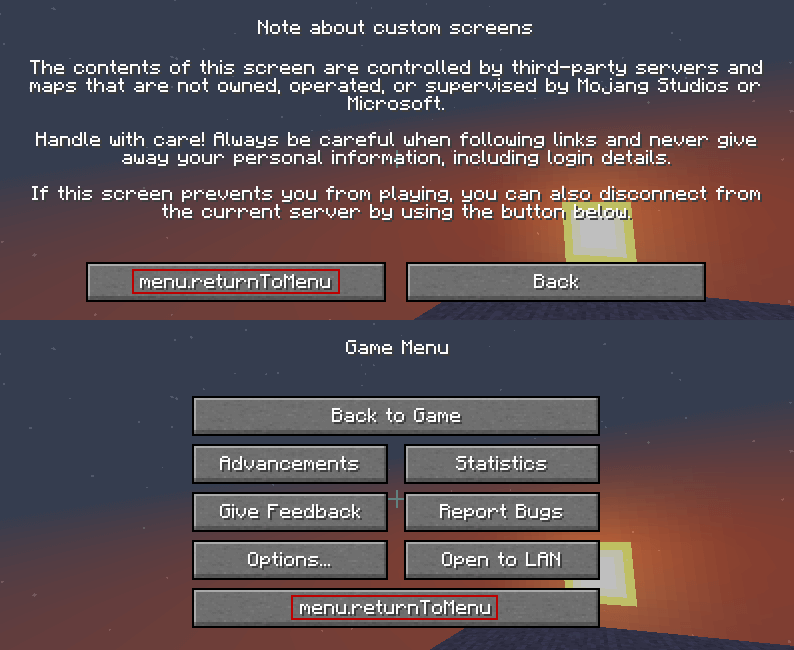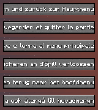 The “Save and Quit to Title” button on the “Note about custom screens” screen uses the same string as the "Save and Quit to Title" button in the Pause menu (menu.returnToMenu), which causes issues in some languages where the text doesn't fit due to the smaller width in the aforementioned screen.