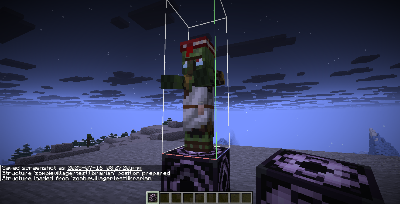 Place a structure block down and load in the structure “zombievillagertest:librarian”. Observe the profession and biome variant.