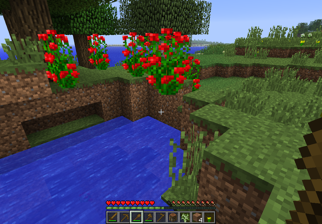 Rose bushes spawned in mid-air, with no supporting blocks underneath. As I stood nearby, two of the three bushes "broke" and fell down, at different moments, without any action taken on my part to cause it. One remained floating as long as I stood around (about a minute).