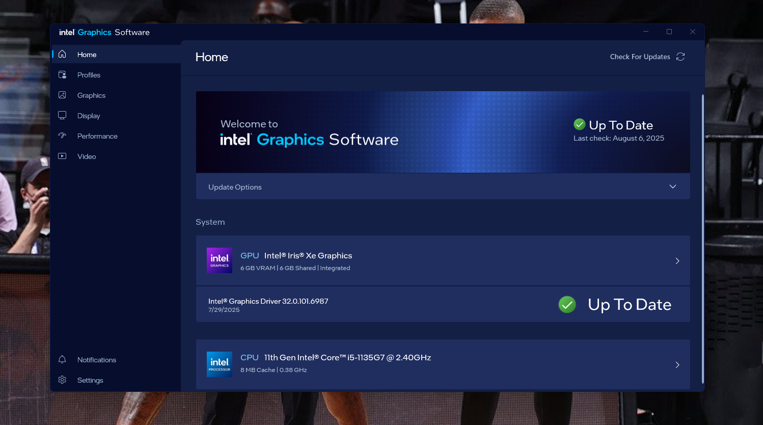 It appears that you are using an outdated graphics driver. The latest graphics driver available for your device — Intel® Core™ i5-1135G7 Processor — is version 32.0.101.6972 (July 22, 2025), but you are on version 32.0.101.5768 (July 29, 2024).