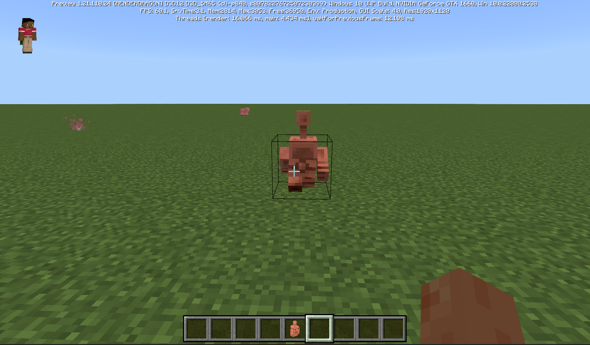 In Bedrock Edition, the statue (all versions) stands straight with only a slight tilt to the right. In Java Edition, however, the tilt to the right is much more noticeable. Ideally, it should be straight, just like in Bedrock Edition.