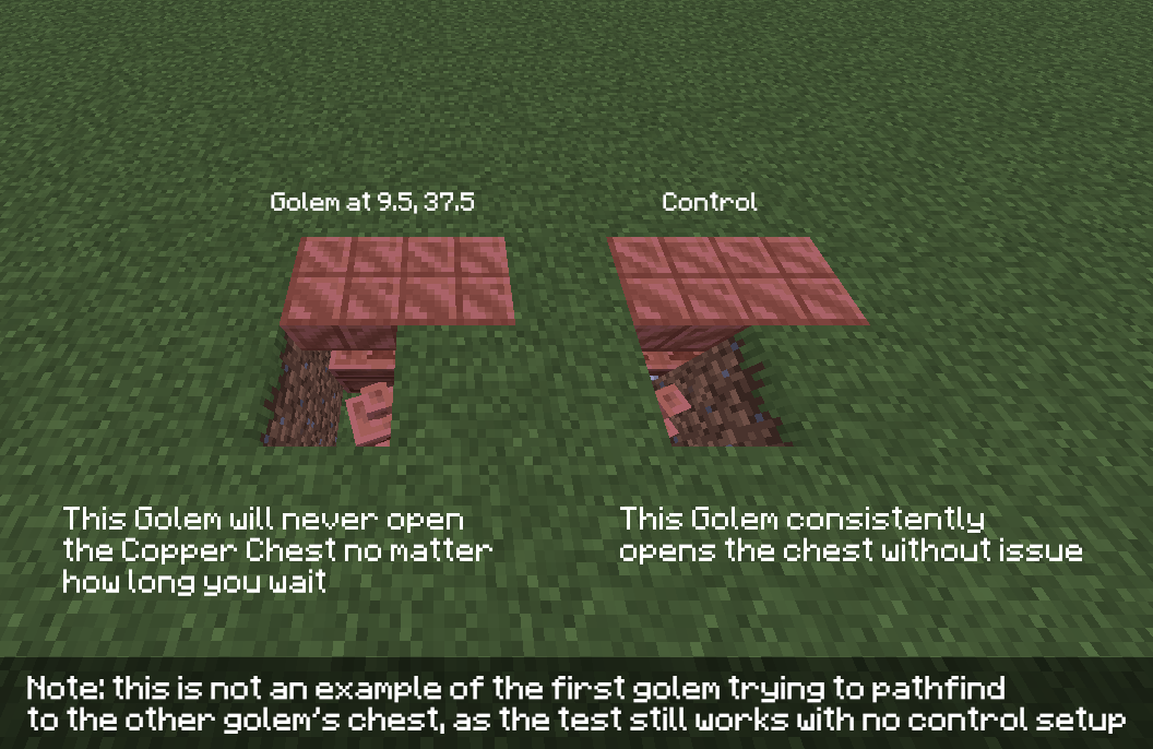 The first Copper Golem will refuse to open the copper chest, while the control will open the chest without problem, despite identical setups. For the coordinates in the example, this happens from bedrock to world-height