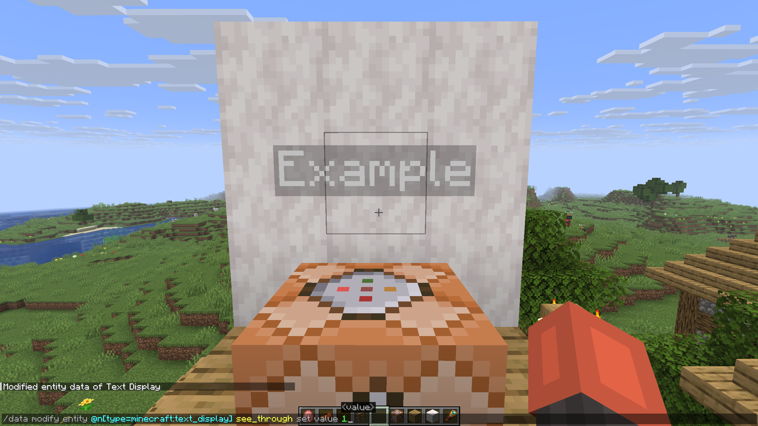 summon minecraft:text_display ~ ~1 ~ {text:"Example"}summon minecraft:text_display ~ ~1 ~ {text:"Example"}Execute the command to modify its “see_through” property
