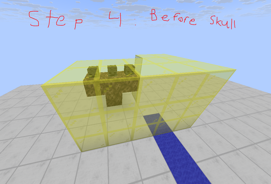 • Place a Wither skeleton skull within 2 blocks of the completed Wither Statue in the North or West direction (or both), at a height equal to any of the 3 layers of the Wither Statue. (This placement area to replicate is highlighted with yellow glass in all relevant images)