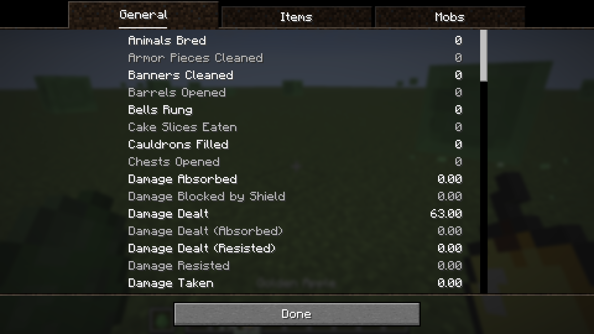 1.21.9 introduced a new statistics screen that looks like the “create new world” screen. The problem with this new screen is that it uses several incorrect textures when using a custom resource pack, or the built-in Programmer Art pack. It is inconsistent with the other options screens.
