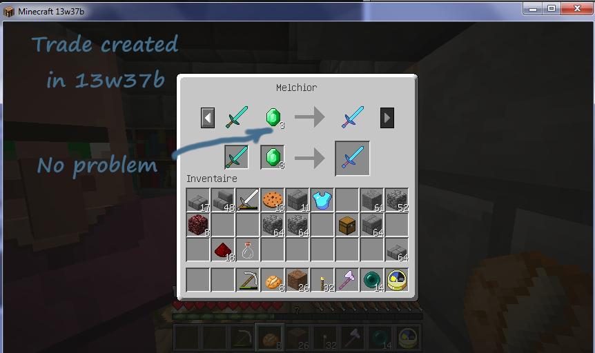 Then, when trading unlocks the followind trade (created in 13w37b), you can see I have to pay emeralds to enchant this sword so it's alright.