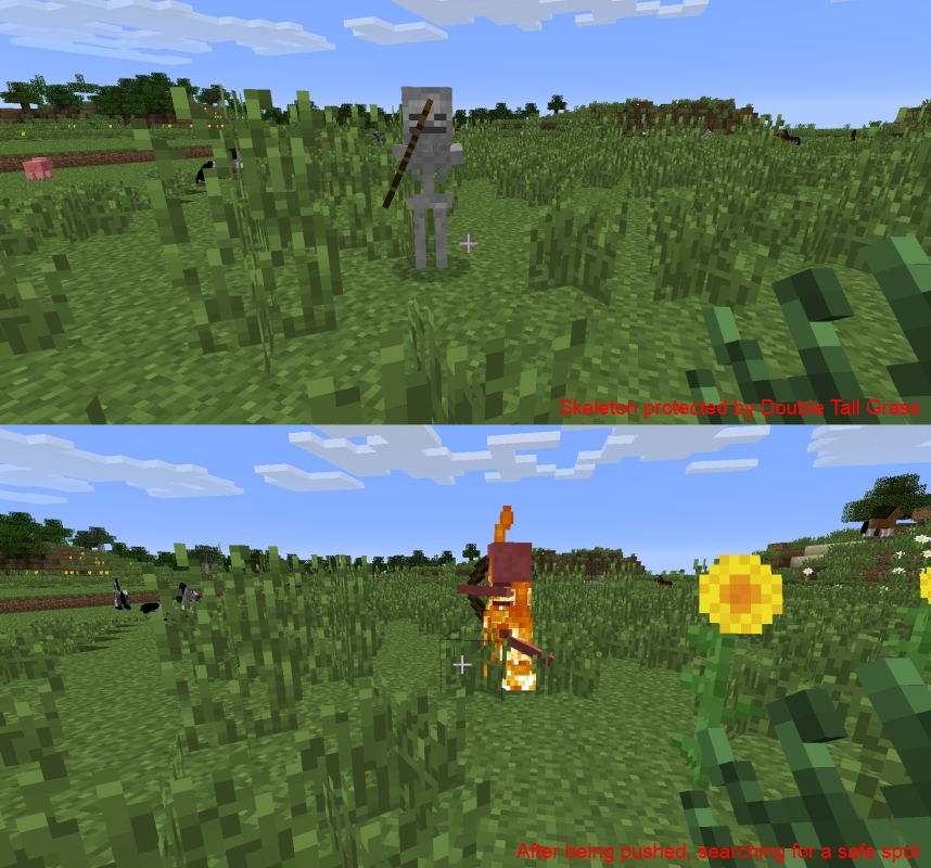 I also spawned Skeletons/Zombies between 2 Tallgrass and they´re all burning and not hiding. Some of them even ran away from the Tallgrass 😃