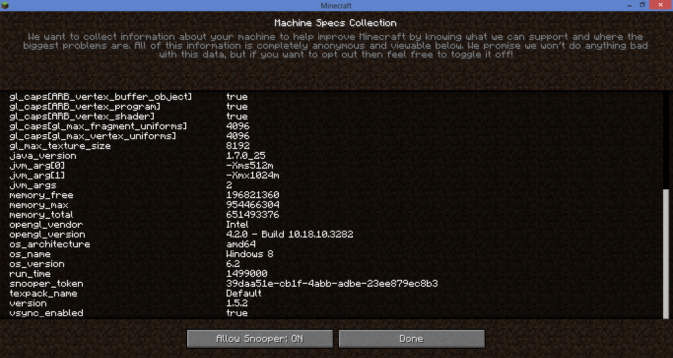 The attached two print-screens are the bottom of the Snooper Settings page, as requested, from 1.5.2 (after downloading the mentioned Minecraft.exe which appears to be an old launcher) as well as the same page from 1.6.4, using the production launcher. I have also attached the a print-screen post-crash. All I did was play for 30 seconds on 1.6.4