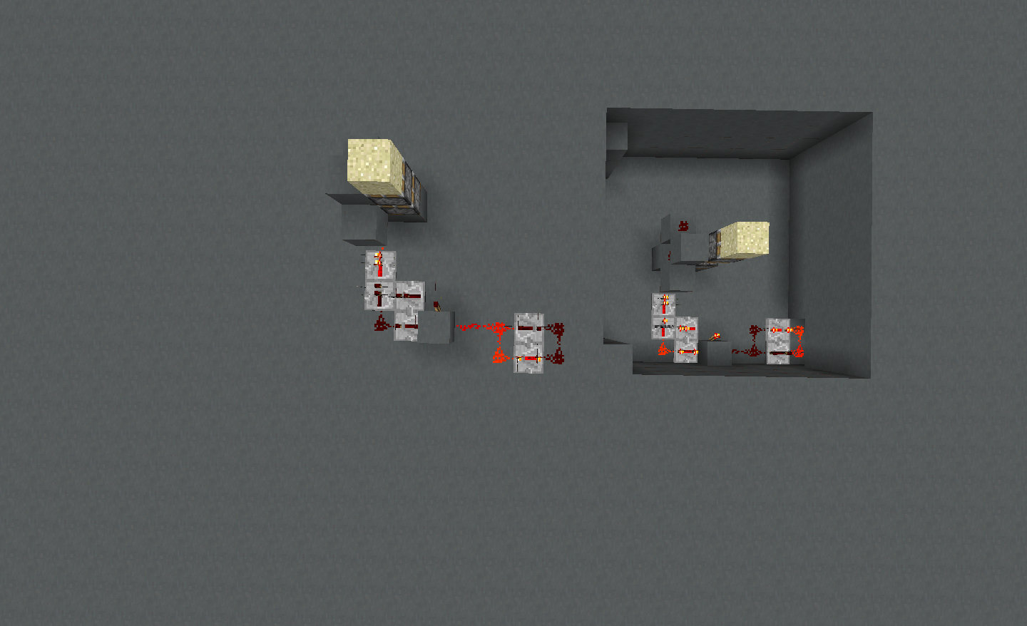 Long story short(ish), I remade CNB's famous compact 3x3 piston door so that it is the same compactness and works in 1.5. I have a super flat world made of Cyan clay, where the ground is at Y=60, and when I first made the door, it worked fine (above ground, so I had extra space, the bottom piston is located at Y =61) . But when I tried to move it underground, i noticed the pistons were acting differently. I've narrowed it down to the part pictured in the images (i've made a simple clock to keep them running so you can see which piston is extending). So when the door was above ground, the TOP piston extends and retracts quickly, leaving the block on it above it, which is the basis behind closing the door.