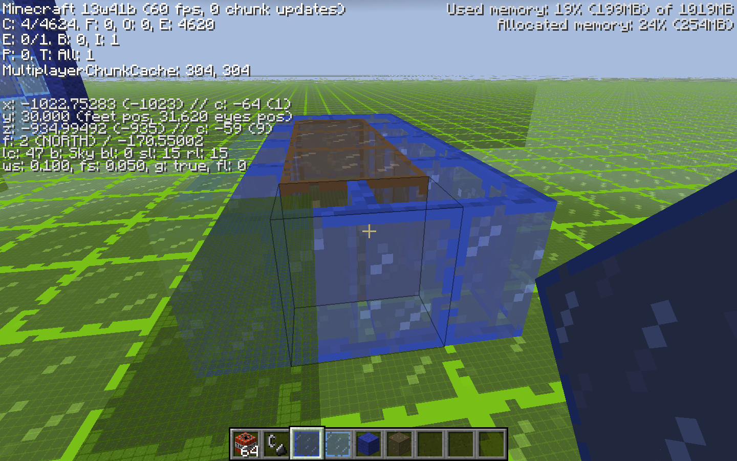 I was playing around with the new stained glass, and created a superflat world consisting of 30 layers of light green stained glass. However, I noticed that when looking at things I built from certain areas, things show through in a way they're not supposed to. I have attached a screen shot of the glitch as it appears, as well as a map where it happens.