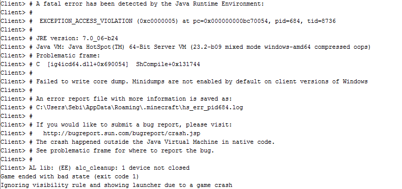 If I'm on the Menu Screen and press WIN+D or klick Minecraft on the Hotbar, then it closes itself and says: "Game ended with bad state(exit code 1)"