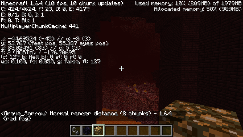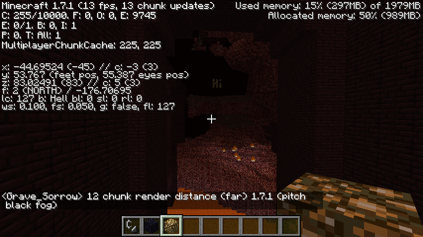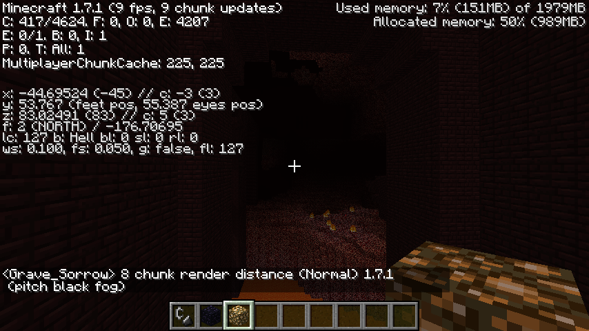 Edit: You can also see that in 1.7.1, my fps is much lower. My pc isn't great to begin with but the fact remains that there are performance issues. I shouldn't be getting 8-10 fps on any render distance beyond 2 chunks and even at 2 chunks I only get about 20. In 1.7 pre, I was getting 40-50+ fps average and at 4 or 5 chunks, close to 40-50. On 7-8 chunks, 20-30. Now in anything 3+ render I get less than 15 fps in 1.7.1.