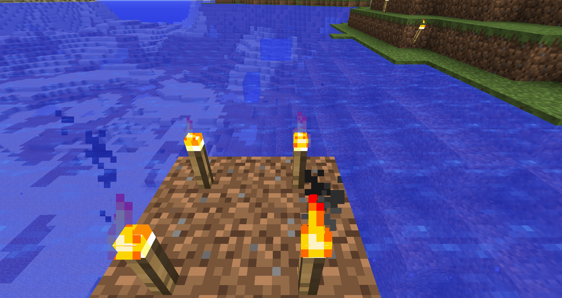 When the torch particles were displayed on and full block, such as the dirt in the image, it was normal. But with water as the background it took on a blue transparency similar to have stained glass in front of the torch.