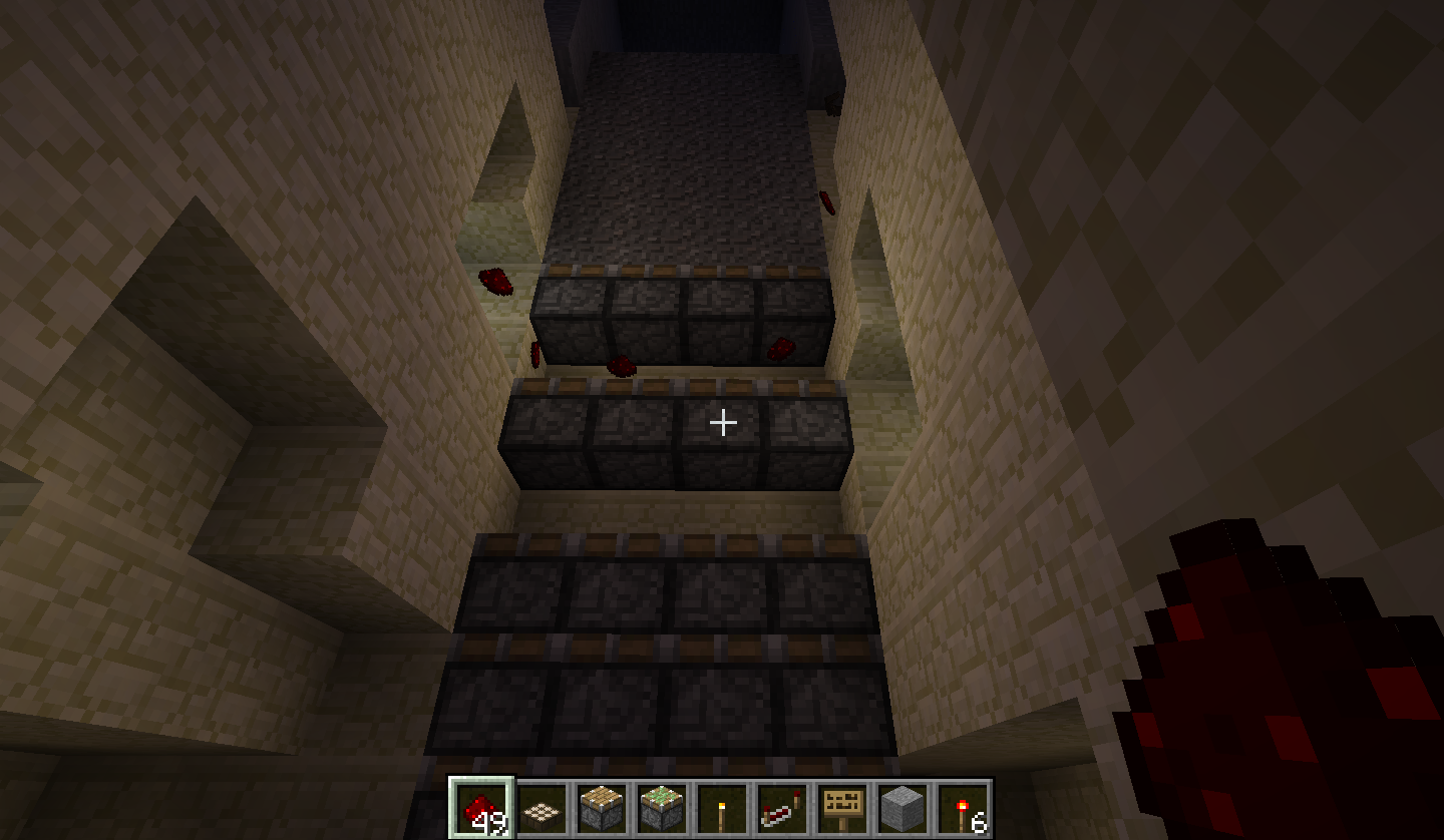 2. Create a redstone signal that should activate all the pistons, using redstone, redstone repeaters, and staircases to reach all of the pistons.