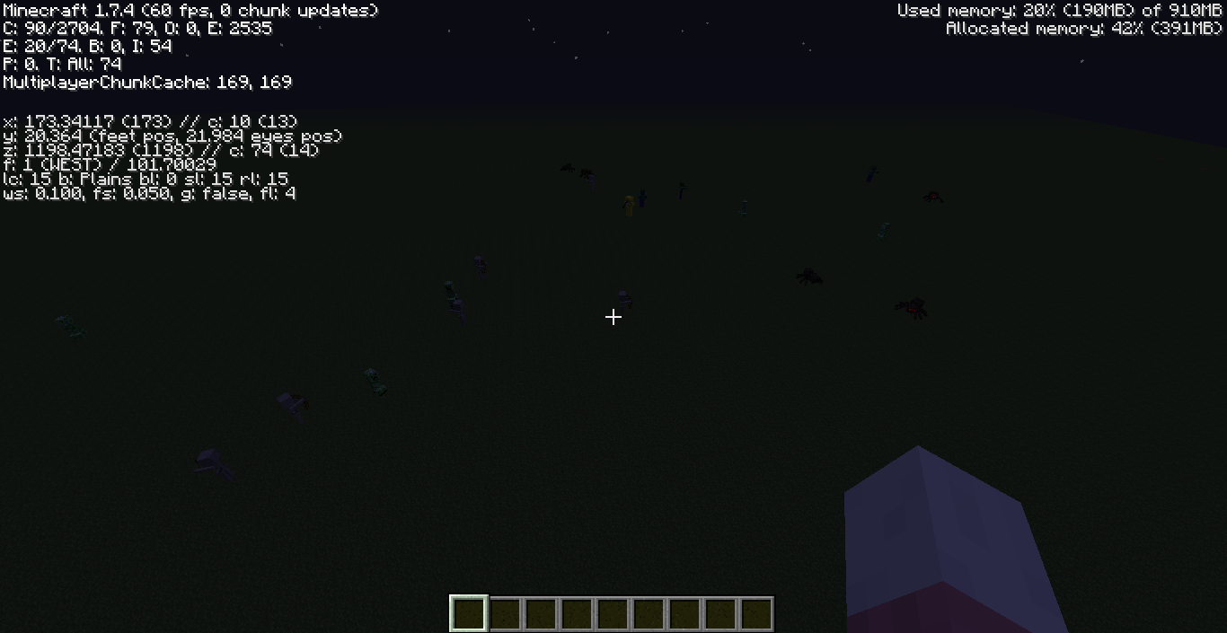 When I updated to the new 1.7.4 version of Minecraft It seemed normal. At first I had reasonable spawn rates, but for some reason after a night or two in game I got 5 mobs at most. They're also not spawning in dark areas like they're supposed to. Having both 32 and 64 bit versions of Java doesn't seem to be the issue since I did that months ago to fix a memory issue I was having in the previous version of Minecraft. I have checked my difficulty many times and it is set to hard. Checking entities using F3 confirms that there are little to no mobs spawning in the caves below. Switching the difficulties did not help and new worlds have the same problem. Switching to a flat creative world spawns many mobs during the night but a default creative world has the same effect as a default survival world.Could this be a height issue?