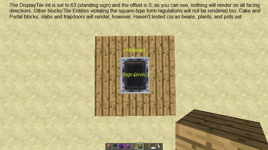 If the "CustomDisplayTile" tag is enabled in entities supporting this tag, using some IDs containing block-form tile entities in the DisplayTile int will not come into effect, as a, ex: Minecart with the DisplayTile int set to 63, 68, or non-full blocks such as doors will render the block displayed, as I chose a sign (63), invisible. I debugged this using various ids in a NBT editor and some of the results are the same symptom I described above.