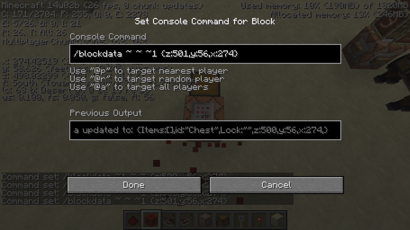 While trying to change the location of a chest via command block by editing the x, y, and z data tags through the /blockdata command, it says that the block was indeed updated, but does not show any change in the tags or to the chest. It is highly likely the command was not intended to be used like this, but while using /blockdata ~ ~-1 ~ {} I noticed it was indeed an option and expected it to work. Even if it was not intended to be used like this, when I saw this I didn't expect it to work, but wished it would as the functionality would be a great asset to my adventure map.