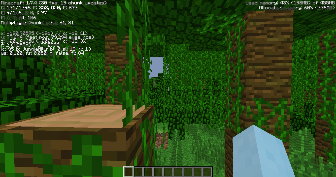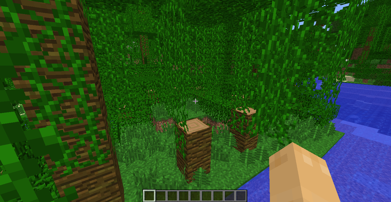 I created a world, with the seed "jeb_", and I found a Jungle Biome, so I went and checked it out. I also found a river going across this Jungle, so I followed it. I was looking around at the trees, when I stumbled upon a tree that had some logs chopped off. I was like "WTF? Weird." So, I moved on, and found another tree with it's logs chopped off. I thought this world was edited by Jeb himself, or something like that. I was astonished by this world, and I have not seen anything like this before. The screenshot below shows what I mean. Put in the seed "jeb_", and see it's features for yourself. The coordinates to the beginning of this river are -212, 79, -127. Facing the Jungle, go to the left, and discover what I see through my eyes.