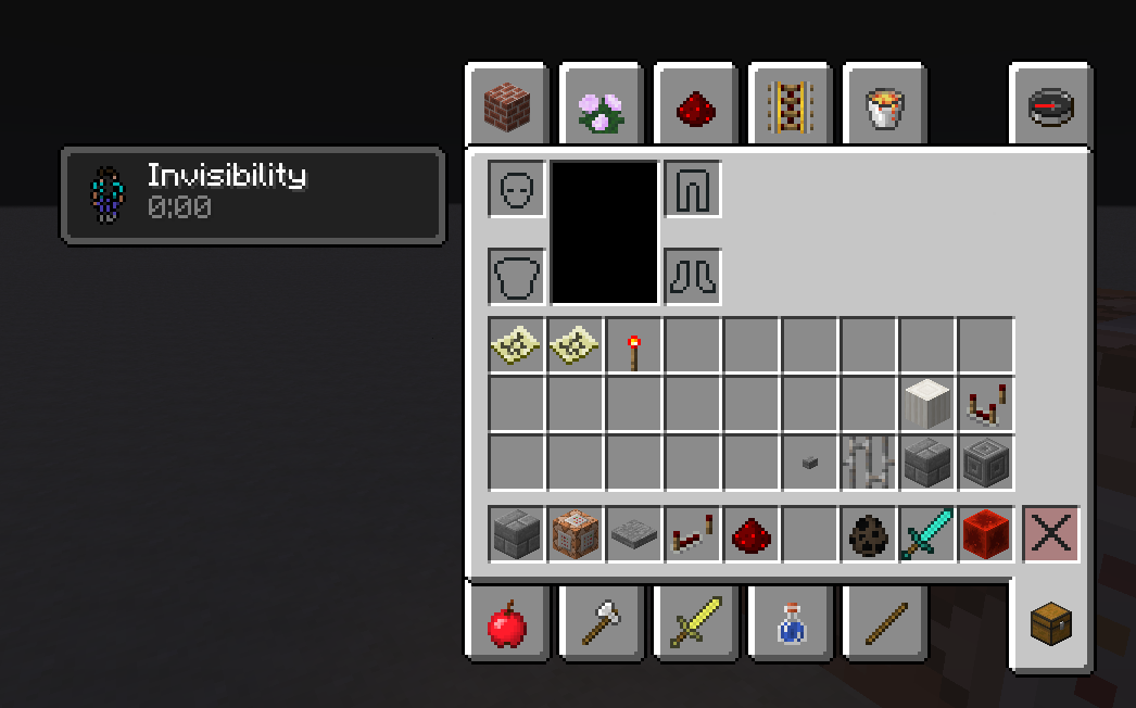 I wanted to run a clock that would give myself a potion effect for 1 seconds "/effect @p 14 1 0", it worked however when the clock stopped and the potion effect ran out; in the inventory it displayed 0:00 but did not disappear. I then tried removing it with "/effect @p 14 0" and it stayed despite the command block displaying "Took Invisibility from [Player Name]"