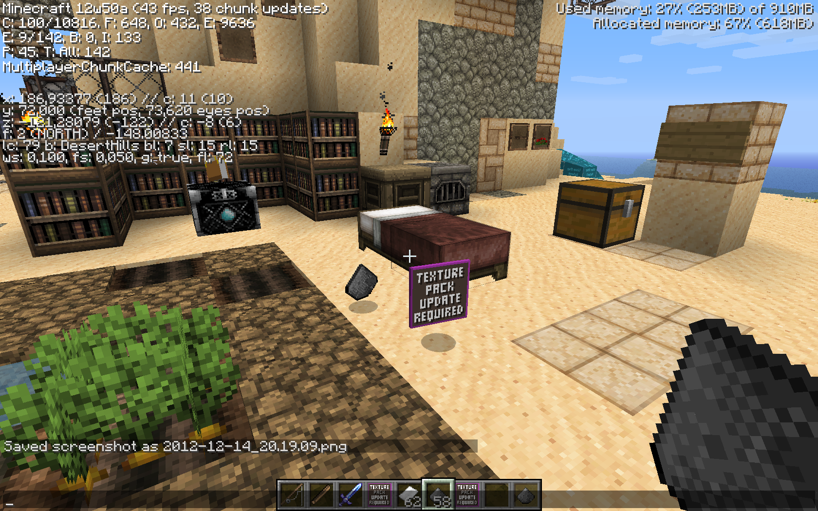Started minecraft, selected test texture pack, going to creative mode