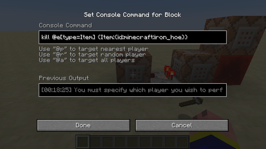 When trying to kill specific item entities with : kill @e[type=Item] {Item:{id:minecraft:<item>}}, a command block will come up with an error saying: You must specify which player you wish to perform this action on. If an OP attempts to use this command, they will be killed as if they just typed in: /kill. Removing the dataTag will cause the command to kill all item entities in the world. Replacing /kill with /testfor will cause the command block to recognize specific items without similar trouble, as shown in the screenshots below.