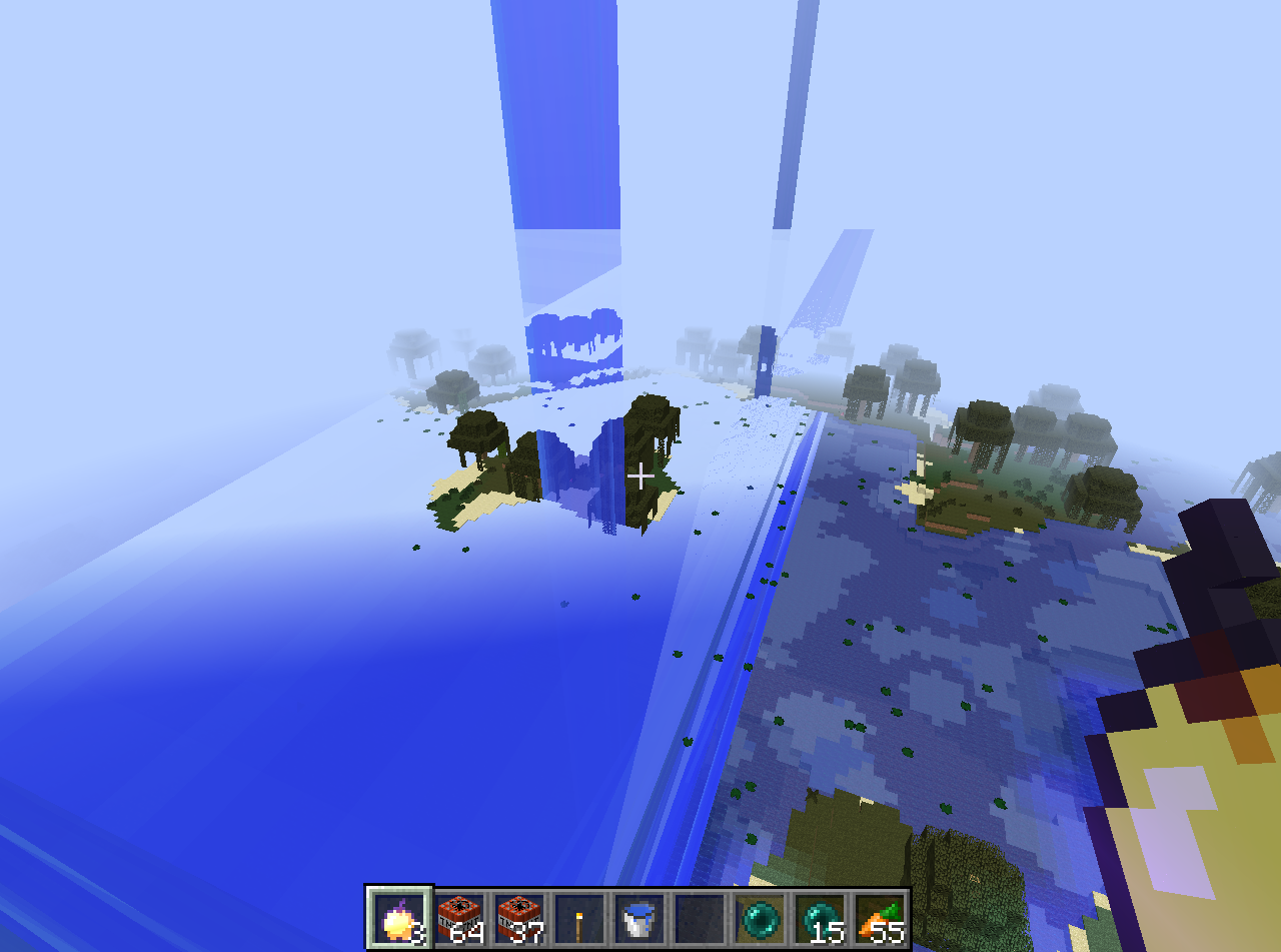 I was flying around, when a huge graphic glitch popped up. This has happened to many people, including some YouTubers, the blocks seemed to be popping up, and sometimes, when you are flying over... let`s say a grass block, the same glitch happens, but the "pop" texture is cobblestone. 1: Play Minecraft for about 30 mins. 2: Fly around.