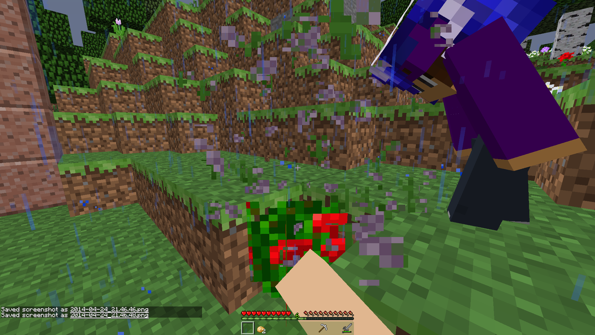 I was playing on a server with the 14w17a Snapshot and noticed that when I hit a Rosebush it would send out lilac particles. I tried it later in creative and noticed that if you are facing EAST and hitting the top block of any two block tall flower they will send out lilac particles, while facing NORTH the particles will be green and while facing SOUTH and WEST they will be gray.