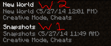 When holding nothing in World 1 (W1), and a dirt block in World 2 (W2).