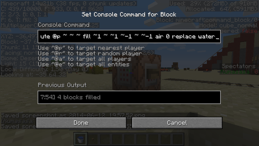 [18:20:16] Failed to execute 'fill ~1 ~ ~1 ~-1 ~ ~-1 air 0 replace water' as Imad_Bush[18:20:16] Failed to execute 'fill ~1 ~ ~1 ~-1 ~ ~-1 air 0 replace water' as Imad_BushBut if I run the command using chat it works fine.