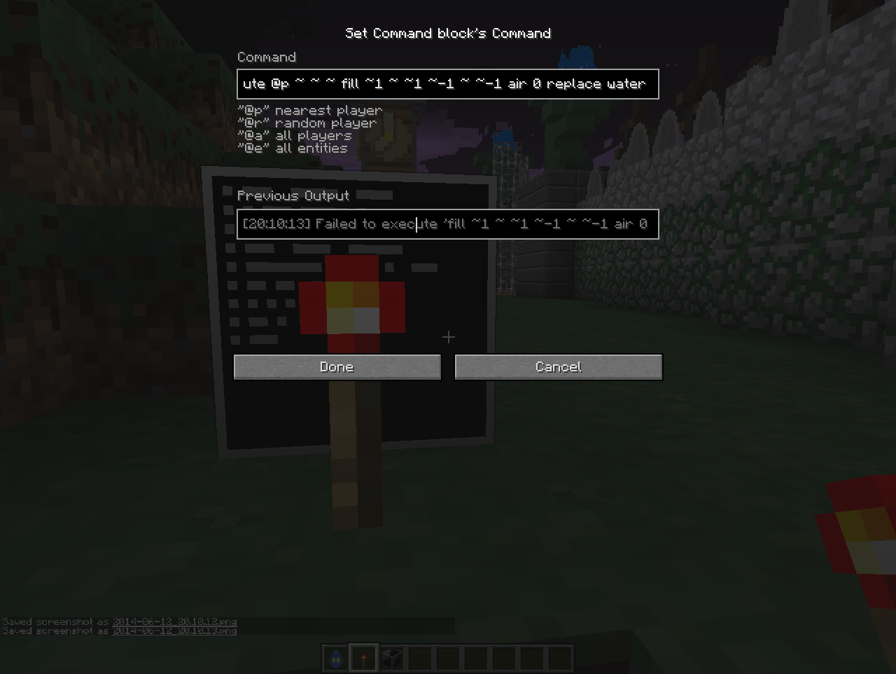 /execute @p ~ ~ ~ fill ~1 ~ ~1 ~-1 ~ ~-1 air 0 replace water/execute @p ~ ~ ~ fill ~1 ~ ~1 ~-1 ~ ~-1 air 0 replace waterExample error