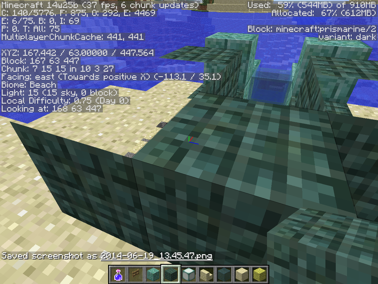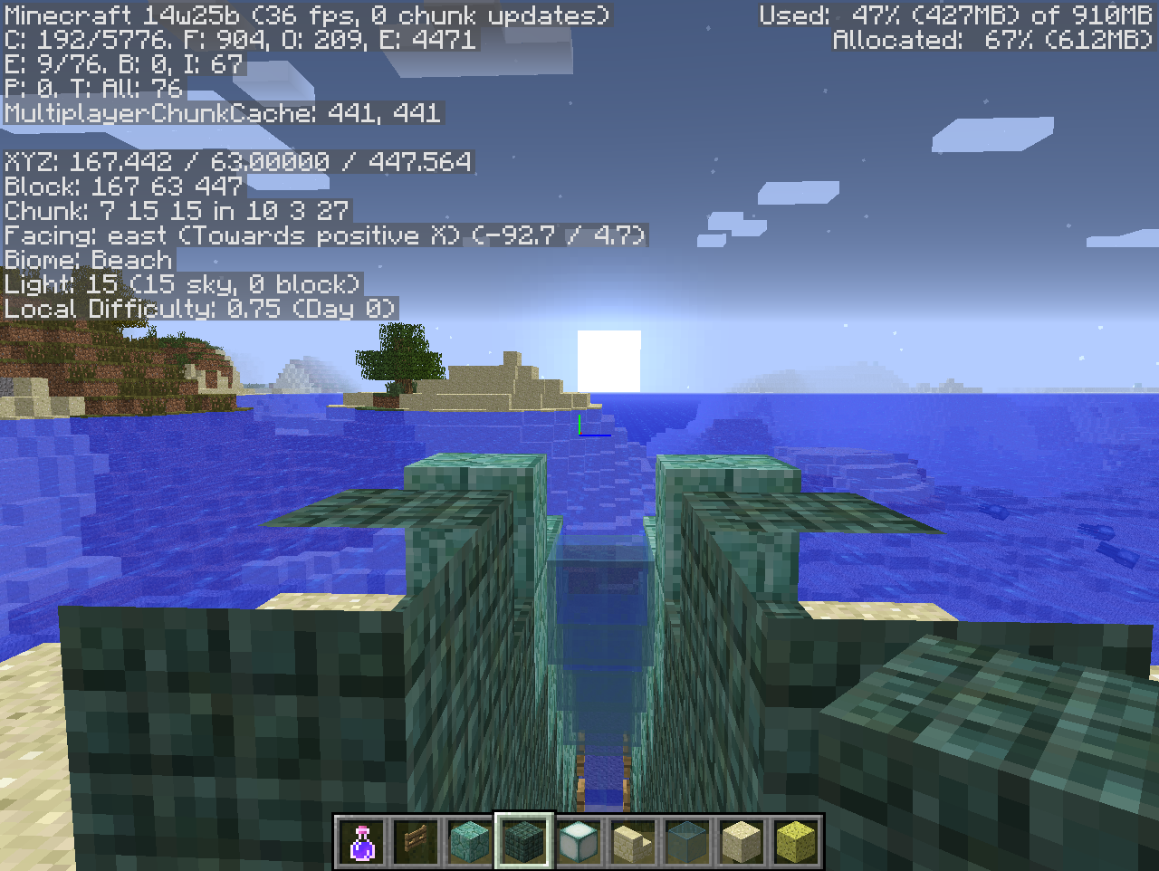 Prismarine blocks like lanterns brick and dark disappear at Y 64 creating a x-ray like thing. 1.7.0_51 Is Java Version. Also I Am On A Server Using 4000Mb. Also looking at leaves from a distance makes them look on fancy graphics when your on fast. Also Flower Textures Are Darker Then Normal.