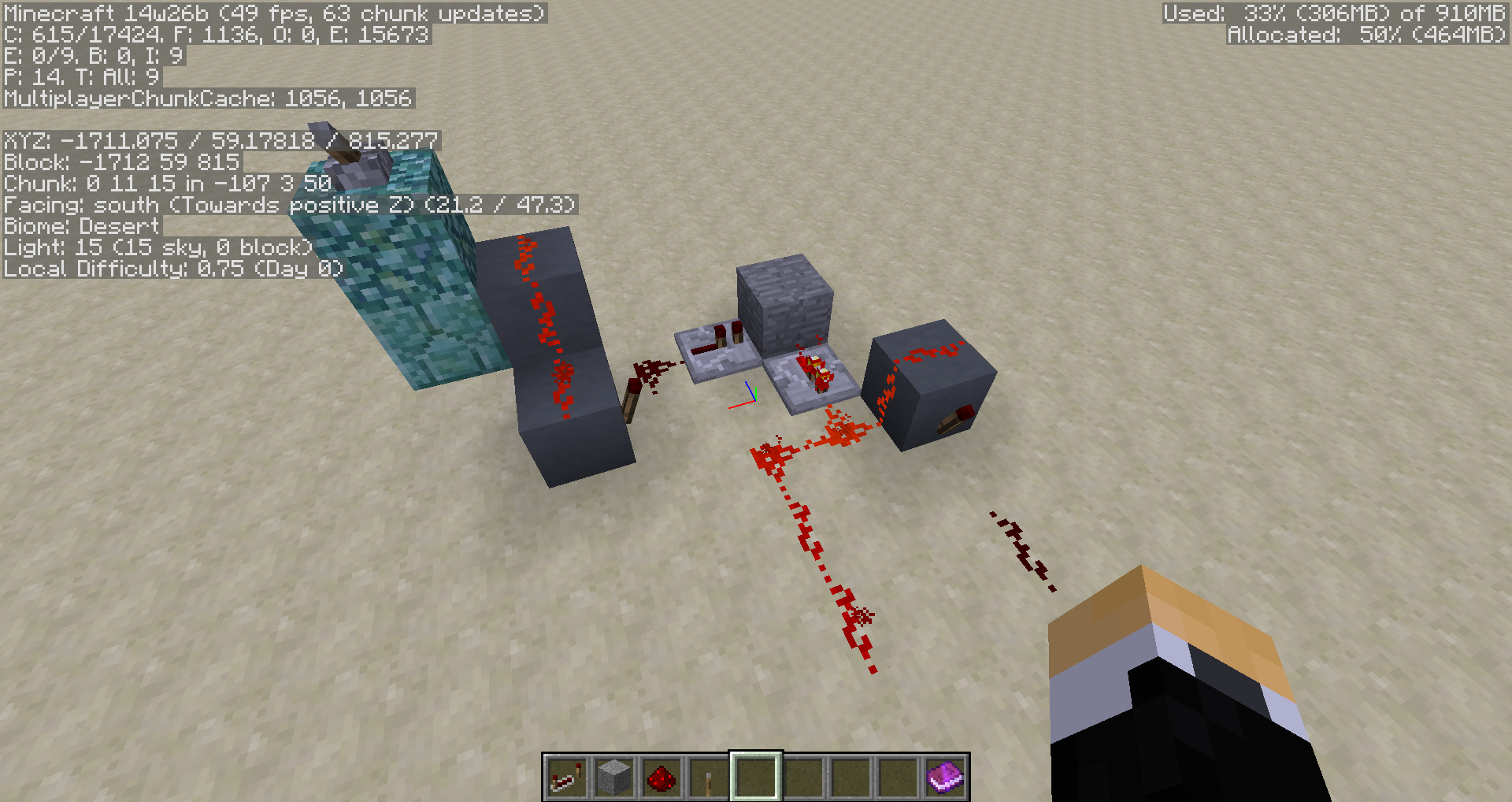 I am working on a map and update when ever I can. I was working on this when 14w26b came out and something really interesting happened. (I am basing all of this off the pictures) When the lever is turned switched on, the repeater I am pointing at in the first image will start flashing on and off. I tried to recreate it in another world but it wouldn't work so i'm assuming it might have something to do with the direction it is facing.