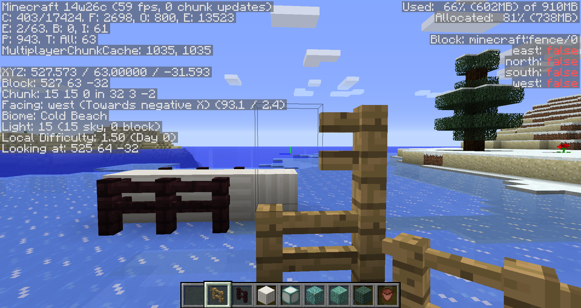 I started up a new creative world to try out some designs, placed a fence down, and noticed that if I placed a fence on top of it, the second fence was invisible. I played around with it and found that it only happens in some areas, as seen by the screenshot. This one is going to be hard to repro I'm sure. I didn't use a seed.